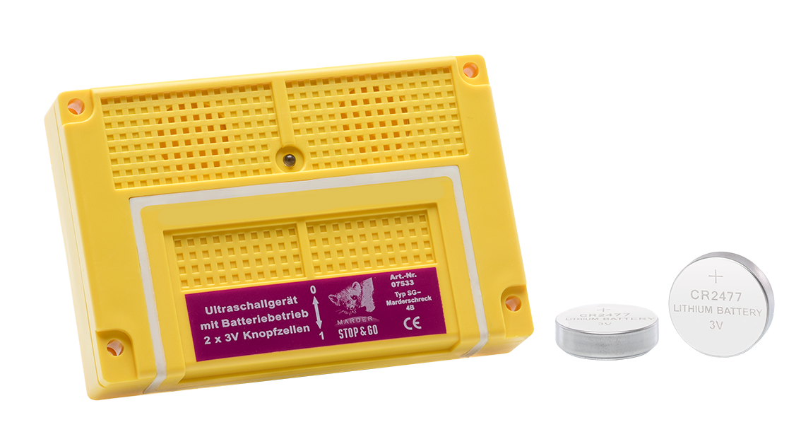 Das Gerät funktioniert mit zwei 3 Volt-Knopfzellen (CR2477) mit einer besonders langen Laufzeit von ca. 24 Monaten je Batterieeinsatz. Es ist keine Installation mit Stromkabeln notwendig. Dieses Ultraschallgerät eignet sich daher besonders gut für Fahrzeuge und Räume wie Dachböden, Schöpfe, Garagen, Gartenhäuser. Ideal für Langzeitparker wie Oldtimer, Wohnmobile, Ausstellungsfahrzeuge oder für den Carport.