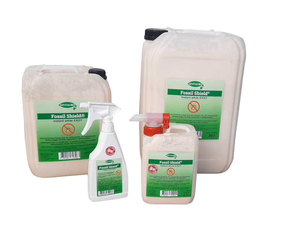 Mode d’action: FOSSIL SHIELD instant white EASY est un produit à base de dioxyde de silicium amorphe. Il agit de manière purement physique par déshydratation. Après l’application et le dessèchement le produit forme une couche de protection crayeuse bien adhérente sur les surfaces traitées. Lorsque les poux entrent en contact avec le produit sec (poudre) ils sont immédiatement neutralisés et desséchés. Les propriétés physiques du produit évitent que les acariens deviennent résistants. - il suffit de secouer et d'appliquer Application: Pulvériser le produit finement sur toutes les cachettes des poux et les endroits où résident les parasites. Il s’agit en particulier des barres portantes, supports de barres, grilles, nids, fissures de tous genres, etc. Le produit ne doit pas couler des surfaces traitées.Recommandation: Appliquer en plus une bande de 20 cm continue à l’intérieur de l’étable à une hauteur de 1 m environ incl. tour des portes, fenêtres, ventilations etc. En cas d’une forte infestation traiter également les parois et les plafonds. Dosage par place de poule: Élevage terrestre, volière: 40-70 g par place de poule. La consommation varie selon le system d’élevage et la technique d’application. Moment d’application: Un traitement avant la nouvelle mise en place des animaux dans le poulailler. Des traitements ultérieurs peuvent être nécessaires durant la période de ponte. L’application n’est autorisée que dans les poulaillers vides. En cas d’infestation aigue par les poux rouges une application dans un poulailler occupé peut avoir lieu. Dans ce cas veuillez recouvrir les mangeoires et abreuvoirs et veiller à ne pas pulvériser les œufs et les animaux. |