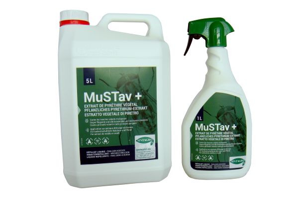 MUSTAV+ est un insecticide répulsif prêt à l’emploi contre les mouches, taons, moustiques, mouches domestiques, mouches piquante (charbonneuse), moucherons (culicoides), tiques, simulies, acariens et autres insectes piqueurs. Approprié pour une application sur les vaches laitières, les chevaux et autres animaux de ferme.
